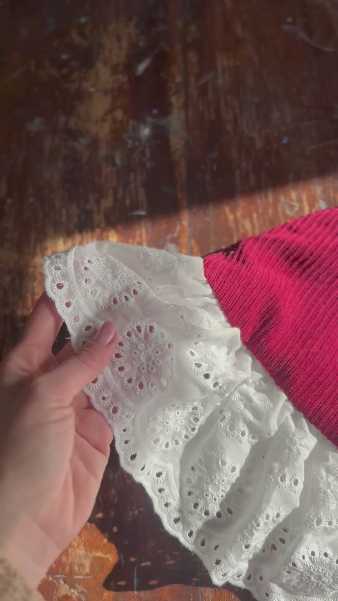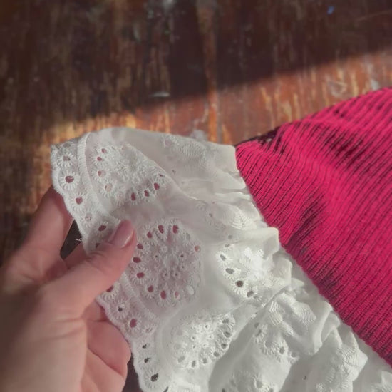 Colletto in velluto a coste bordeaux con arricciatura in cotone sangallo.